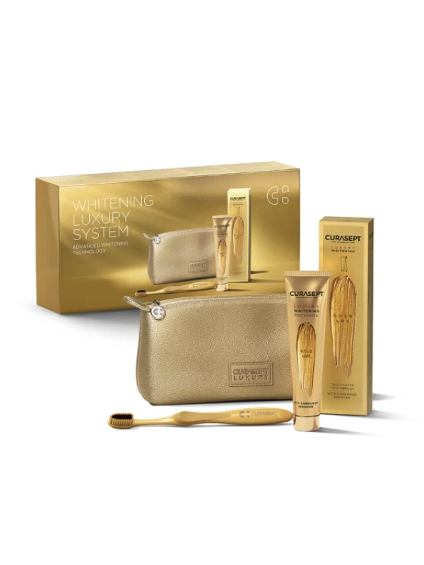 Set za izbjeljivanje zubi CURASEPT GOLD LUX s pastom za zube, četkicom i toaletnom torbicom je najnaprednija linija za izbjeljivanje cakline gdje pasta i četkica djeluju sinergijski.